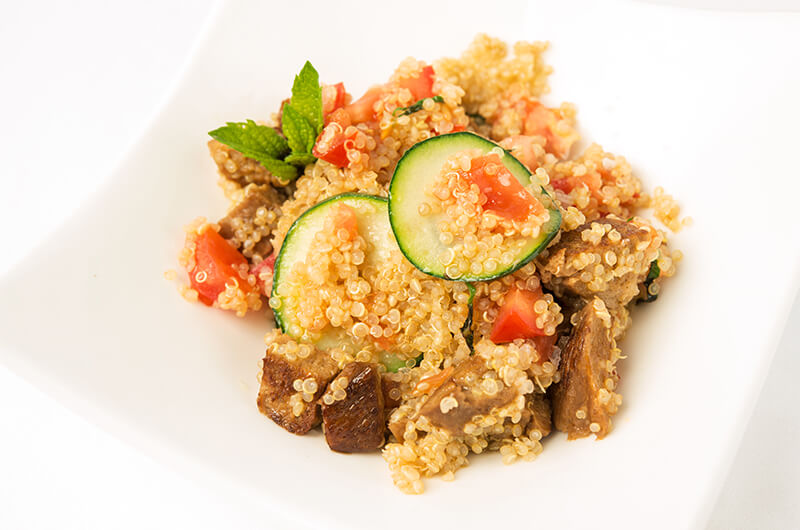 - Mezclar la quinoa con el seitán y las demás verduras.